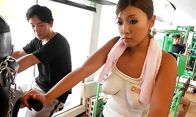 Ample breasted bra-less bitch Nami Himemura hooks up with several guys at the gym